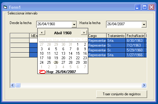 La tabla que se utiliza es la tabla "Empleados", y el campo de fecha usado en la consulta Sql es "FechadeNacimiento" de dicha tabla.