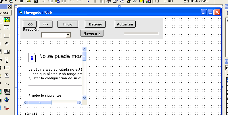 La vista previa anterior muestra la ventana de diseño y los controles para agregar. Como podés ver no usé iconos ni nada, eso lo podés hacer vos a tu gusto. Tampoco se utilizó un control ToolBar de Visual Basic, si no que se colocó un control PictureBox que contiene los botones para navegación. También contiene una barra de progreso, un combobox para la barra de direcciones, el control webbrowser debajo del control Picture, y debajo del control Webbrowser un control Label que será el que muestre el enlace actual de descarga de las páginas y el estado de descarga, mostrando la url, sería como el statusbar o barra de estado.