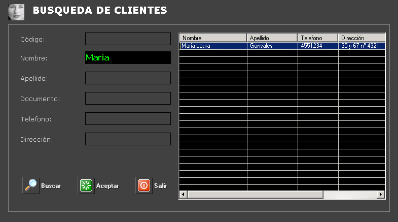 Dentro de este procedimiento se le agregan en tiempo de ejecución al ListView los encabezados de columna correspondientes, se cambia el título del formulario (que en realidad es un Label, ya que el Form no tiene Caption), se le carga otro icono en la esquina superior izquierda, se cambian los Labels al costado de los TextBox de entrada de datos para buscar etc... Por ejemplo acá pueden ver que la pantalla es la misma pero adaptada para la búsqueda de Clientes cuando presionamos buscar y estamos en dicha sección:
