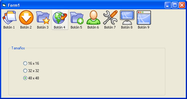 La primera función lee unos íconos de 32 bits que se encuentran en la carpeta del proyecto. y luego dibuja las imágenes mediante DrawIconEx en un Hdc temporal, en este caso en un picturebox, y estas se añaden en tiempo de ejecución a un control imagelist que luego se asocia a un control toolBar