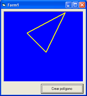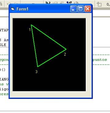 Este simple código fuente es similar al anterior, pero dibuja el polígono, en este caso un triángulo, utilizando el mouse. Es decir al hacer 3 clics en el picture para definir los puntos ( En el evento MouseDown), luego se llama a la función Polygon para dibujarlo: