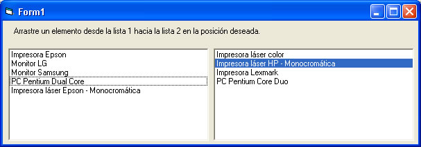 Este código es exactamente igual al anterior, con la diferencia de que permite arrastrar el elemento en la posición donde se desee, es decir que se agregará en el list2, de acuerdo a la posición del mouse en el momneto de soltarlo.