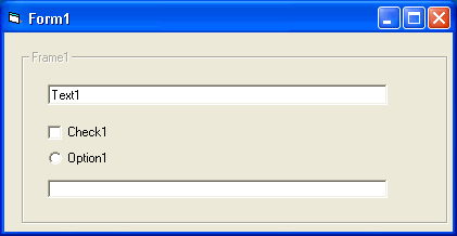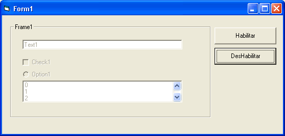 Si por ejemplo tenemos un control Frame que tiene dentro controles y le establecemos la propiedad Enabled en False, los mismos quedan deshabilitados pero se verían de la siguiente forma: