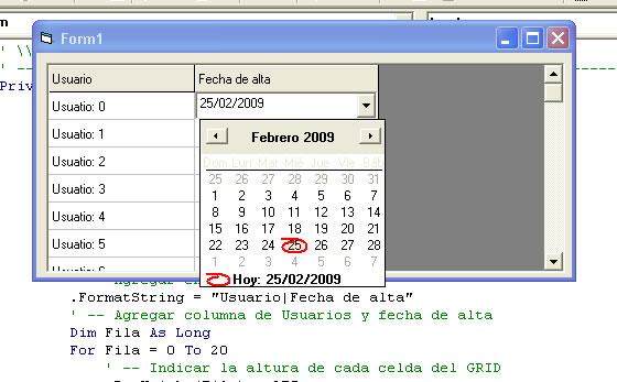 Este ejemplo permite editar directamente celdas de un MsFlexGrid o HierarChical FlexGrid, una fecha, por medio de un control Dtpicker oculto que se posiciona en la celda correspondiente cuando se hace DobleClik en dicha celda o se presiona la barra espaciadora. Luego al seleccionar la fecha y presionar la tecla Enter , la misma se asigna a la propiedad textMatrix, es decir se asigna el valor a la celda correspondiente.