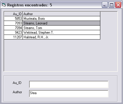 El formulario de ejemplo utiliza la base de datos Biblio ubicada en la carpeta de instalación de visual basic. ( Tabla Authors )