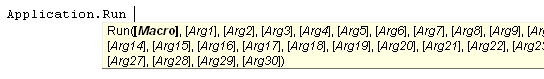 Este simple ejemplo usa el método Run de vba y accede (desde vb ) a un libro de Excel que tiene una macro, y mediante el métotdo Run , que tiene los siguientes parámetros :