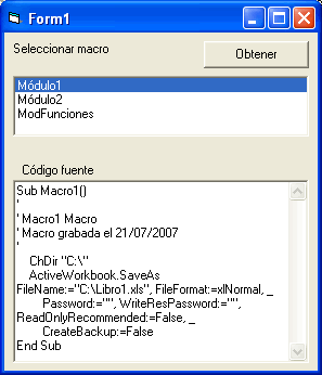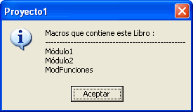 Nota: el ejemplo, cuando recorre los módulos del WorkBook indicado, realiza un bucle para determinar si el módulo de código, es decir la macro, no está vacia, es decir que contiene código . Si el módulo existe pero está vacio, no lo toma en cuenta .