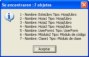 Este otro ejemplo, realiza un bucle y lista los objetos del libro indicado, para obtener : el nombre y el tipo de los mismos ( UserForms, Módulos comunes, módulos de clase , hojas, libros). El resulatado se visualiza en un Msg Box