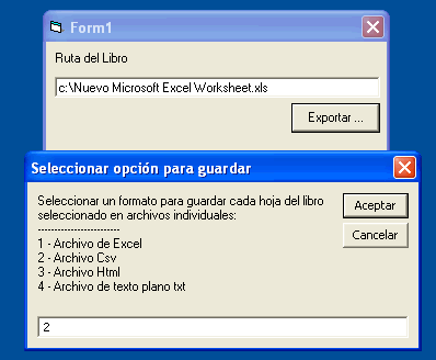 Luego dependiendo del formato elegido, va guardando el contenido de cada hoja individualmente en el App.path del proyecto con el método SaveAs de vba .