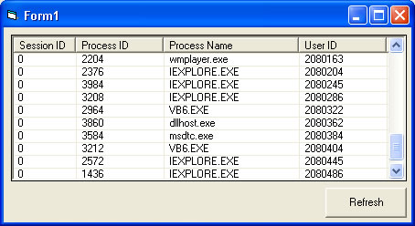 Código de muestra enviado por Mariano M Villarel, que lista los procesos en un List View, mediante la función del api de windows WTSEnumerateProcesses de la librería wtsapi32.dll , visualizando el Session Id, el Process Id, Process name y el User Id, y un command button para refrescar el listado
