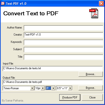 Ejemplo en vb 6.0 creado por Samar Pathania, que muestra una forma de poder crear a partir de un archivo de texto plano, un archivo pdf