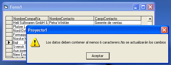 Luego, al intentar modificar un valor o dato en las columnas 0 y 1, si el valor ingresado contiene menos de 6 caracteres se muestra un mensaje y cancela la actualización dentro del evento colocando la variable Cancel con el valor true