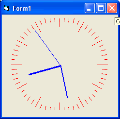 Colocar un control Shape redondo, y 3 controles Line llamados Horas, Minutos y Segundos como la siguiente imagen