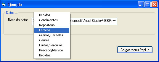 Este ejemplo simple muestra como cargar datos de un campo de una base de datos Access, en un menú Popup en forma dinámica usando DAO.