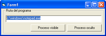 En el ejemplo se lanza el programa escrito en el textbox , ejecutando la rutina EjecutarProceso, que tiene dos parámetros, la ruta y el modo de ejecutar el proceso , si es visible o invisible. Por ejemplo :