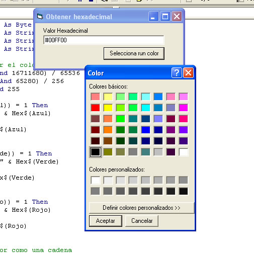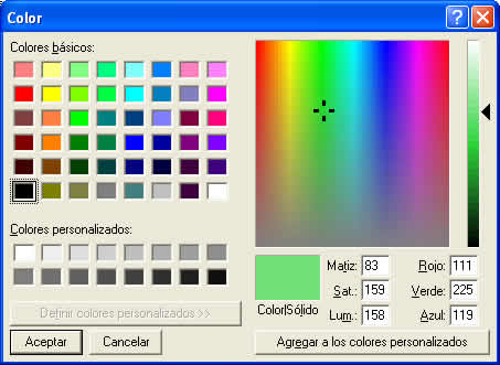 Con la propiedad Flags también podemos hacer que el cuadro de diálogo se visualice completo, es decir incluyendo la sección para definir colores personalizados, utilizar la barra deslizante para mezclar los colores, ver los valores RGB, el Matiz y saturación.