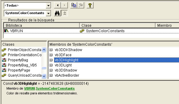 Si deseamos obtener y saber los valores de colores que utiliza windows para todos los objetos de la interfaz gráfica de la configuración actual : Color de fondo de la ventana, Color de los botones de las aplicaciones, Color del texto de los controles, bordes de las ventanas etc..., los puedes averiguar, consultando las constantes. Estas constantes se acceden desde el examinador de objetos de Visual basic.