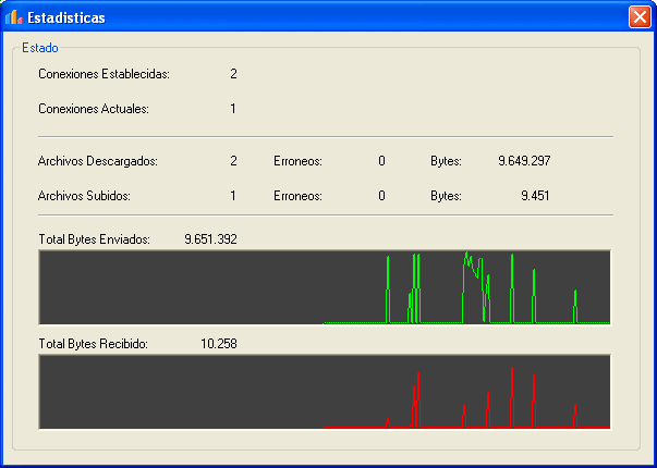 Pantalla de estadísticas para la actividad del server ( la cantidad de archivos subidos y descargados, la cantidad de bytes , la cantidad de conexiones que se realizaron, las que están acualmente activas, los posibles errores al subir o colocar recursos, y un gráfico estadístico para la cantidad de bytes enviados y recibidos)
