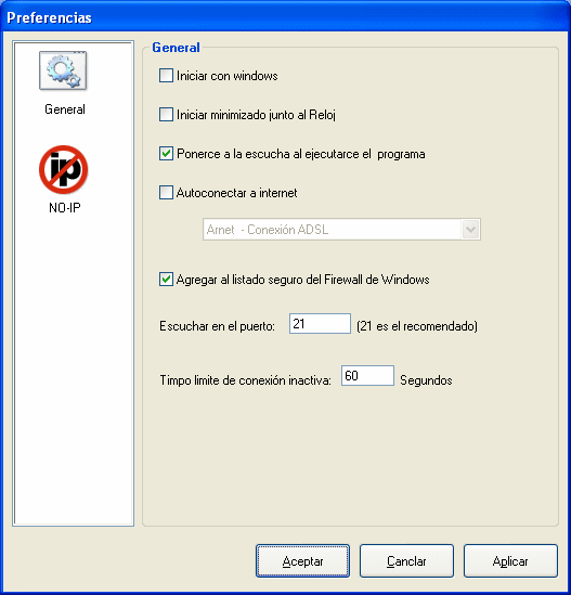 Ventana para configurar el server ( para indicar el puerto , autoconexión en caso de reinicio del sistema , una opción para poder utilizar si no se tiene un dominio o ip estática , el servicio de no-ip para poder acceder al server en cualquier momento , y otras opciones )
