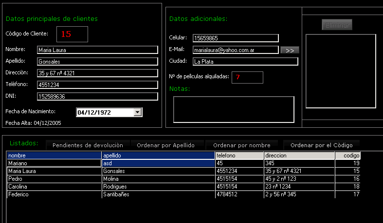 El listado que aparece abajo es un control MsFlexGrid llamado flexgrid(0), osea está en un array, ya que en la pantalla de Productos (Picture1(2)) se utiliza el flexgrid(1) para ver un detalle de productos por debajo del Stock. Estos FlexGrid son solo para visualizar datos y no para modificar. El FlexGrid de la pantalla clientes como está en la imagen, podemos listar los clientes ordenados de acuerdo: al apellido, al Nombre, al código de socio y los pendientes de devolución de películas.