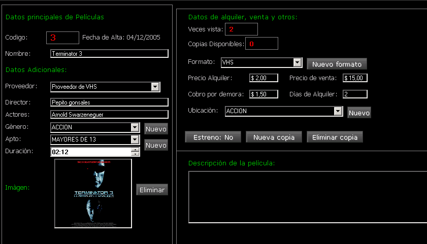 Clientes, películas, productos y proveedores. Este tiene una botonera superior que cumple la función a la de un ToolBar.