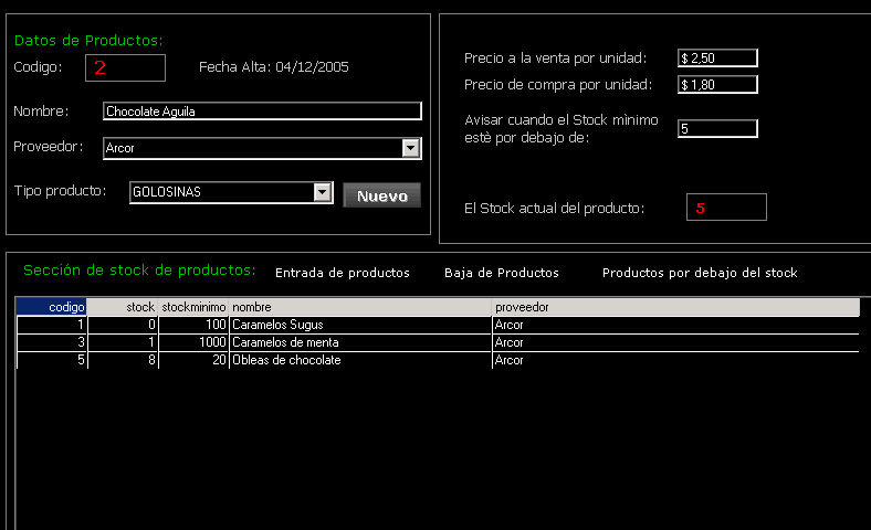 Desde esta pantalla podemos añadir productos nuevos, eliminar dar de baja, modificar el precio etc...