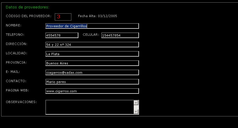 Esta pantalla da de alta y baja datos de proveedores y es una pantalla opcional, es decir que no es necesario tener ingresados proveedores para poder dar de alta Productos. Los datos de Proveedores están en la tabla "Proveedor" y al igual que las demás el número de código de cada proveedor es de tipo autonumérico. Los datos que ingresemos acá, aparecerán reflejados en la pantalla de Productos y de películas.