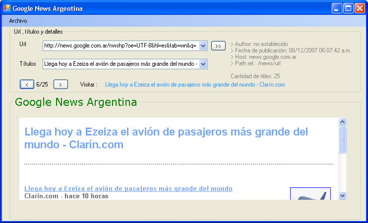 Este es un simple proyecto que hice realizado con esta Dll. Es un formulario que pemite cargar un Feed, y luego obtener en un combo los títulos. Luego al seleccionar un item carga la descripción en un control webBrowser, y muestra otra información como el autor , la fecha , la hora de publicación y en un control LinkLabel la url