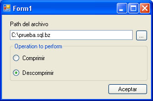 El código fuente tiene un formulario con dos botones para realizar las operaciones de compresión y descompresión ( solamente para un archivo ) , también una clase con dos métodos : Compress File y Decompress File. Ambas funciones tiene como parámetro las rutas de los archivos origen y ruta de destino