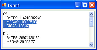 Luego al iniciarlo , en el código se recorren las unidades accesibles en el equipo para obtener los bytes ( propiedad TotalSize de DriveInfo ) , y se realiza la conversión mediante dos simples funciones que retornan una cadena con el valor en Megas y Gigas. El resultado de la conversión se visualiza en la caja de texto
