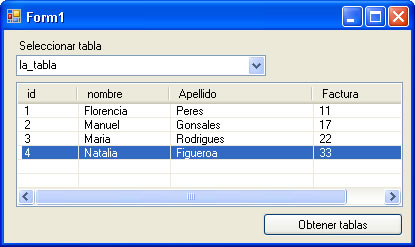 Nota: la función para obtener los nombres de tablas y poder cargarlos en el combo, está sacado de este ejemplo en c# de la página del guille, es una simple función que utiliza una sentencia T-SQL y retorna un objeto DataTable y luego se enlaza a un control ListBox.